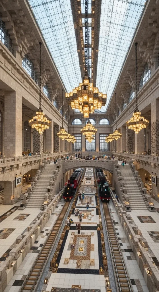 Chandeliers, banners, and grand staircases make the station feel luxurious and important. This kind of station works perfectly in big Minecraft cities.