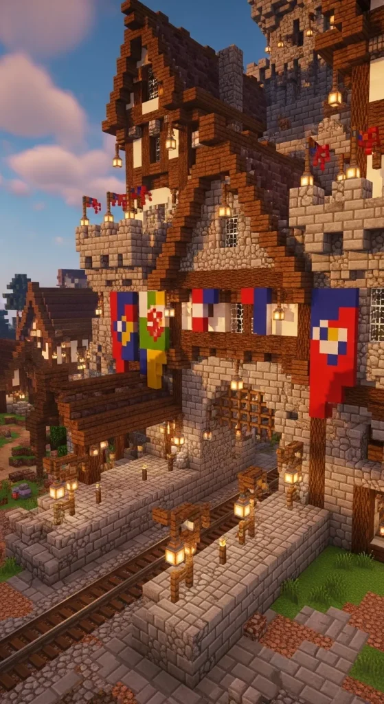 If your world has castles and medieval towns, a medieval train station is a perfect match. This design uses cobblestone, stone bricks, wooden beams, and lanterns to create a rustic and historical atmosphere.