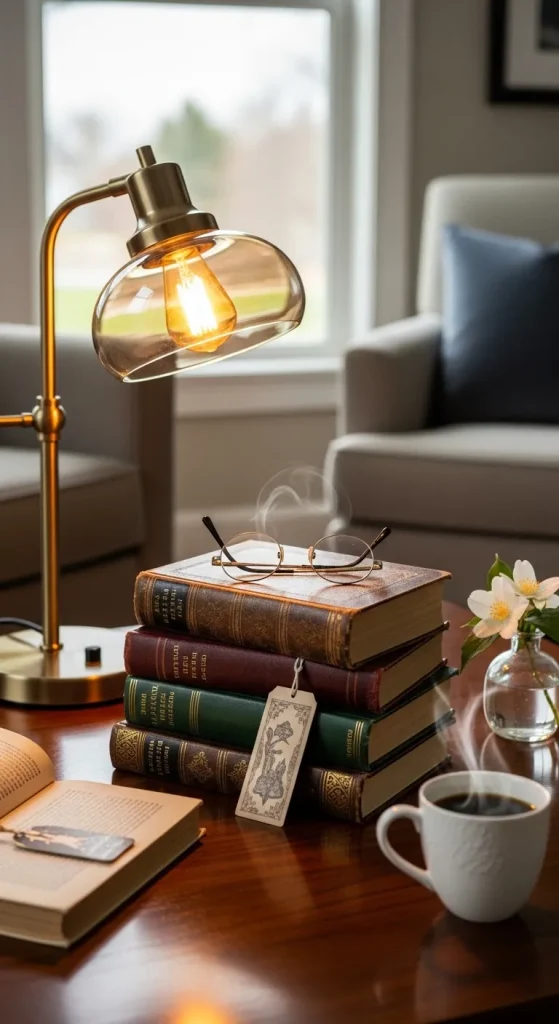 Turn your table into a mini library. Stack books horizontally and vertically, mixing large coffee table editions with smaller paperbacks. Add a stylish reading lamp or a pair of reading glasses for a lived-in, intellectual charm. This approach makes your table both decorative and functional.