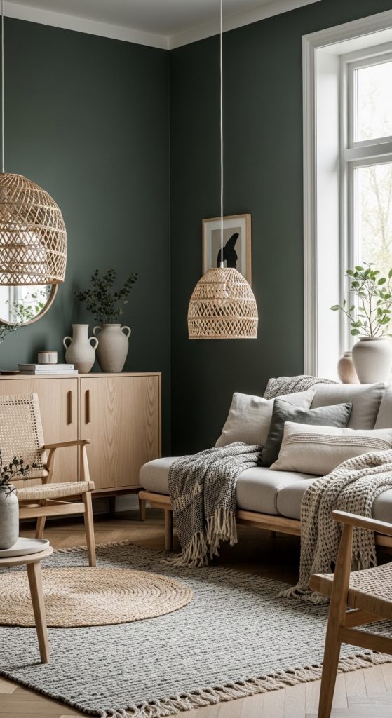 Think dark green walls with walnut shelving, oak coffee tables, or wooden accent chairs. Add woven baskets, linen curtains, and neutral textiles to keep the room feeling light and natural.