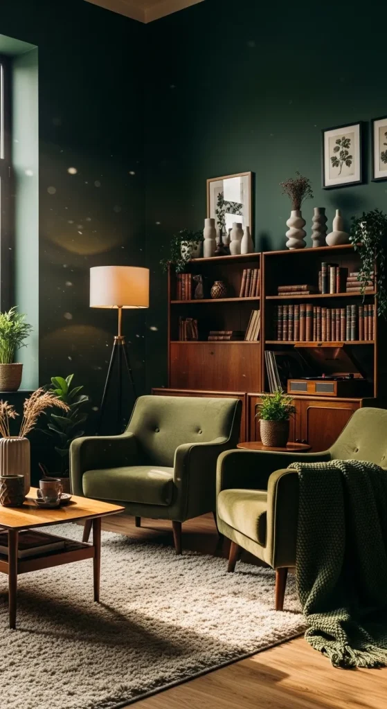If you love cozy and relaxing spaces, a moody dark green living room might be perfect for you. Paint the walls in a deep forest green shade and combine them with warm lighting and soft textures.